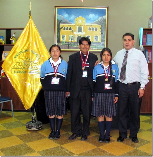 Las escolares Thalía Yanela Ricra Cárdenas (15) y Sara Carhuamaca oré (17), del colegio San Mateo de Huanchor – provincia de Huarochirí, quienes ganaron el primer puesto del concurso de Ciencias e Ingeniería 2011, realizado en México, visitaron la municipalidad provincial de Huarochirí para agradecer por el apoyo brindado por la alcaldesa provincial Rosa Vásquez Cuadrado y por los nueve regidores que conformen el concejo provincial.